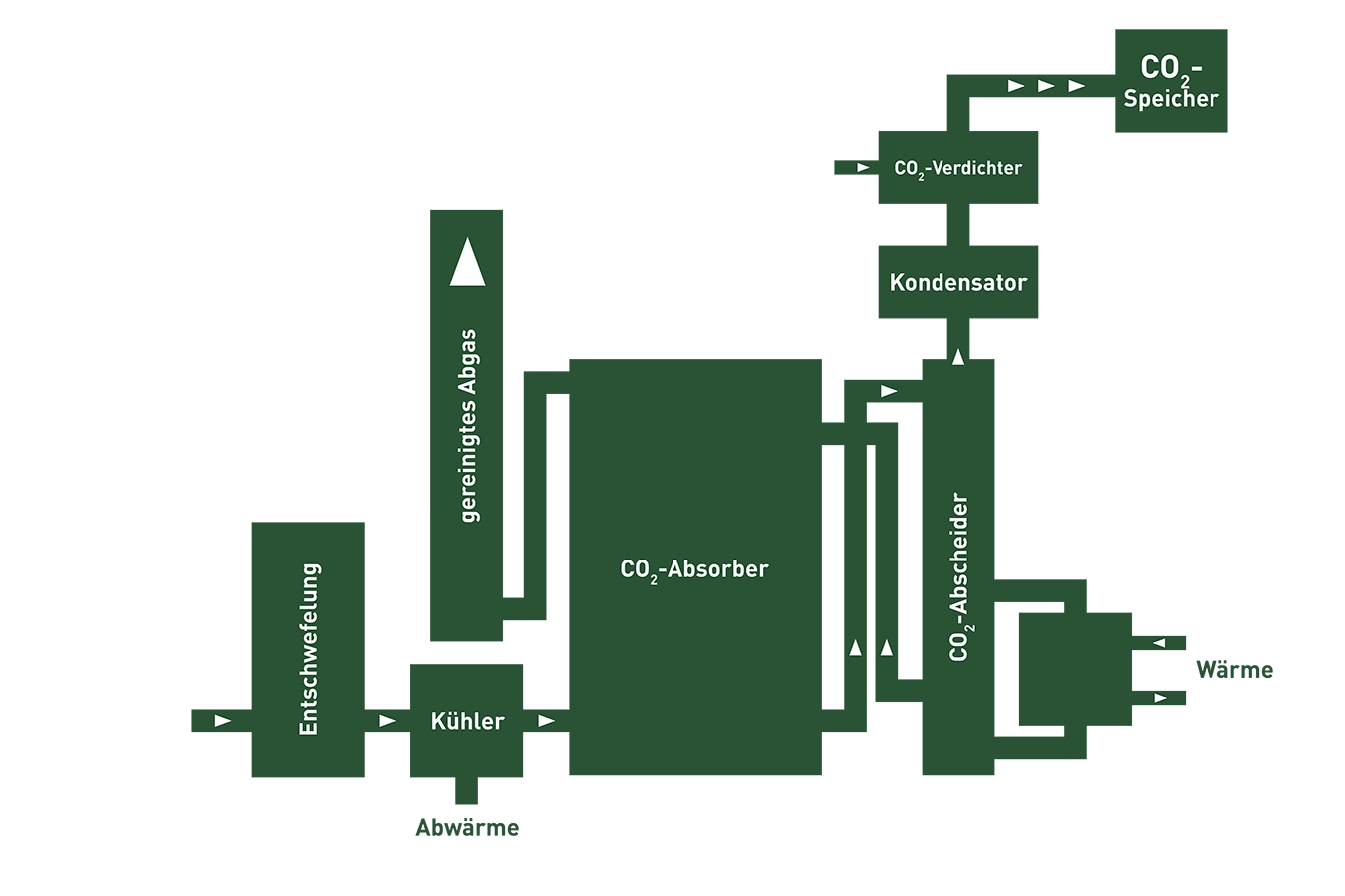 Durch diesen Prozess wird das Gas aus dem Abstrom separiert, während die übrigen Bestandteile unverändert entweichen. Das CO2-beladene Lösungsmittel wird anschließend in einen Desorber geleitet. Dort wird das CO2 durch Erwärmung wieder freigesetzt, anschließend getrocknet und gereinigt, sodass es als hochreines Gas oder verflüssigt für industrielle Anwendungen bereitsteht.